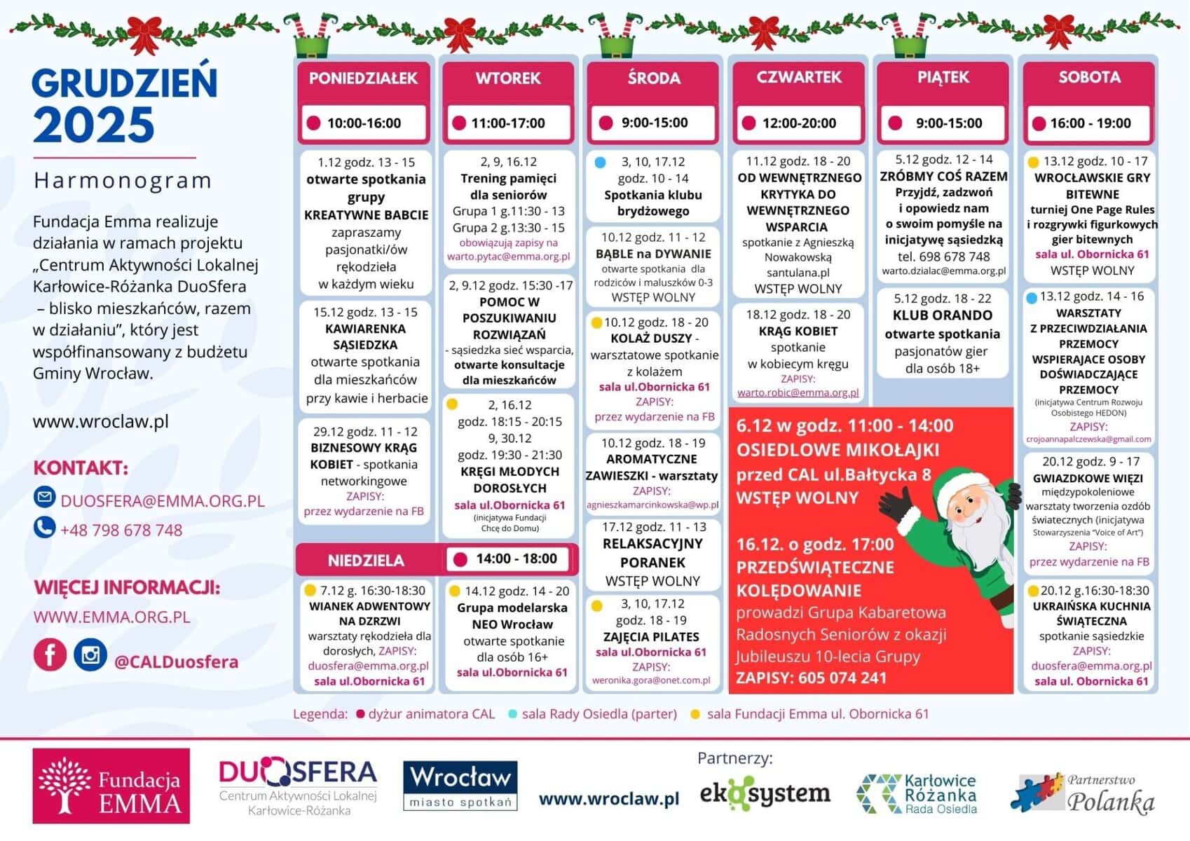 Udział w zajęciach jest bezpłatny. Fundacja EMMA realizuje działania CAL w ramach projektu „Centrum Aktywności Lokalnej Karłowice-Różanka DuoSfera – blisko mieszkańców, razem w działaniu”, który jest współfinansowany z budżetu Gminy Wrocław.