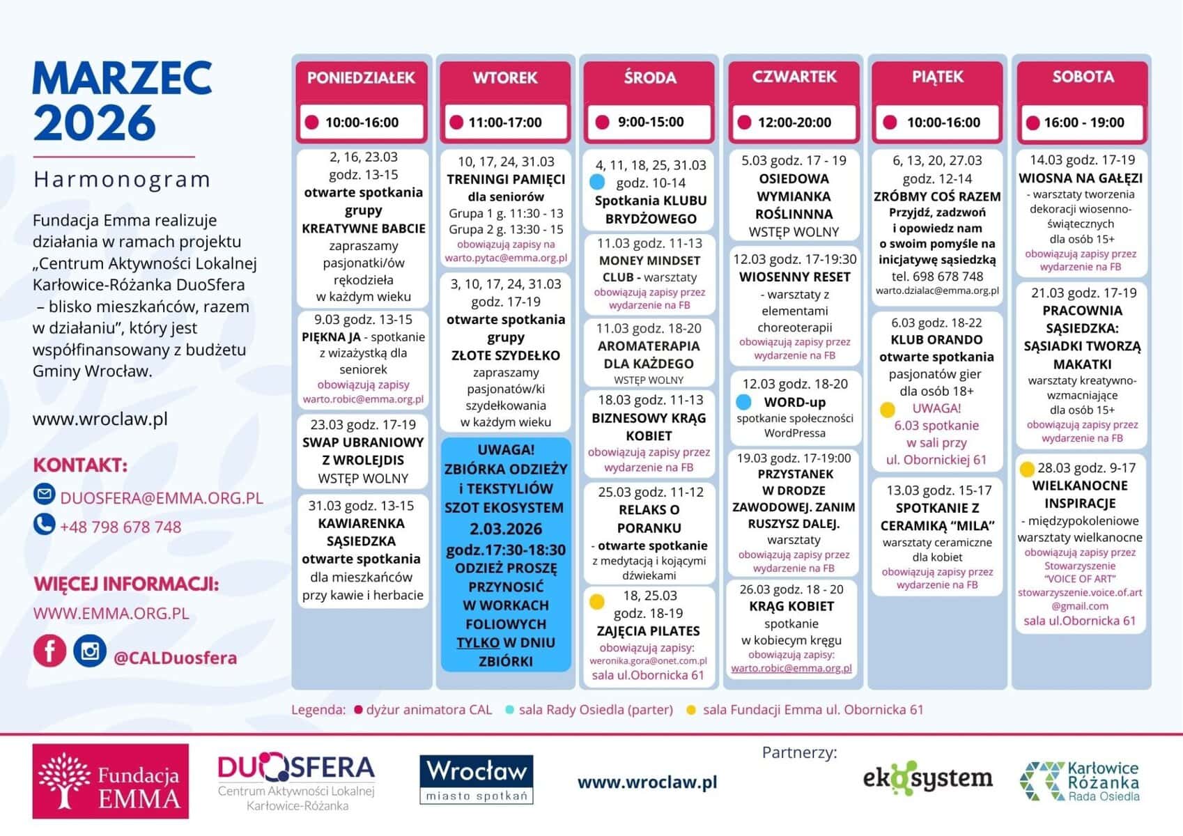 Udział w zajęciach jest bezpłatny. Fundacja EMMA realizuje działania CAL w ramach projektu „Centrum Aktywności Lokalnej Karłowice-Różanka DuoSfera – blisko mieszkańców, razem w działaniu”, który jest współfinansowany z budżetu Gminy Wrocław.